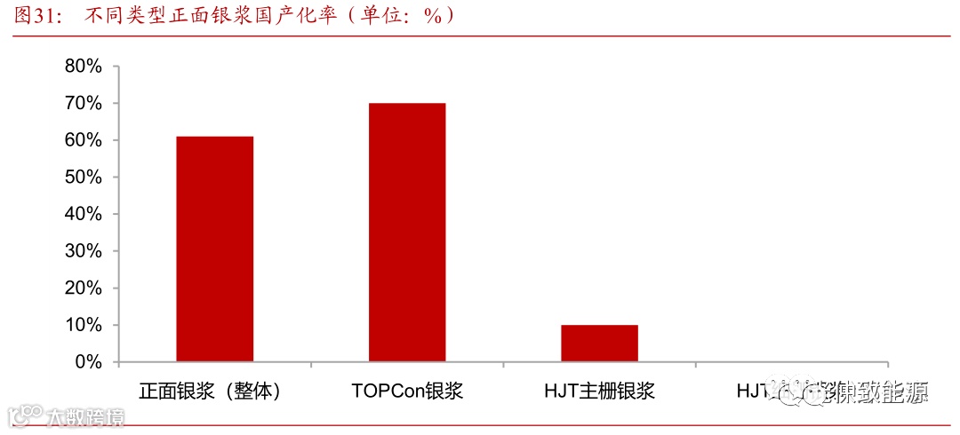 N型HJT低温银浆尚依赖进口,国产供应商处于起步阶段。整体来看N型电池浆料的国产化程度仍较低,约为20%左右。目前HJT低温银浆市场占有率最大的供应商是来自日本的KE。