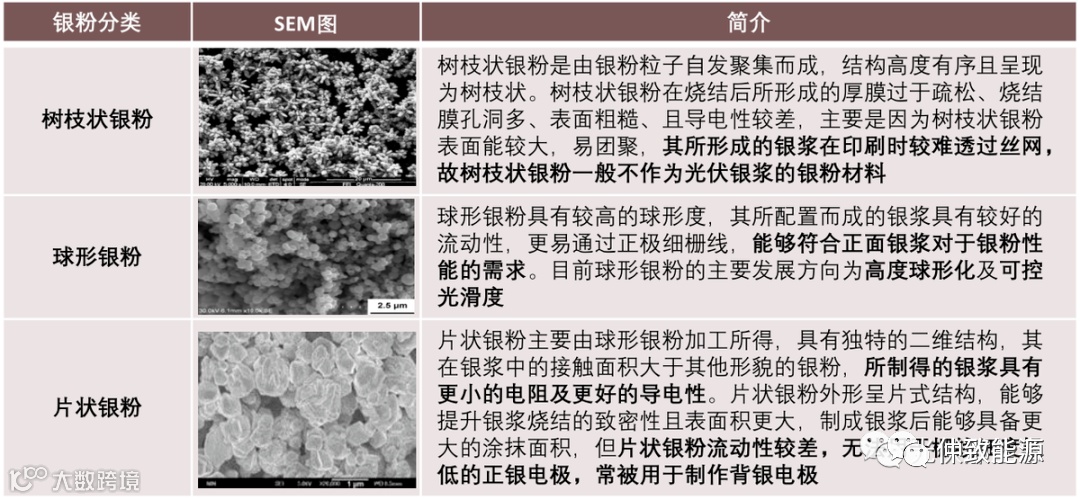 由上可知,银粉是生产光伏浆料最重要的原料,其形貌、粒径、分散性及振实密度等特性皆对其电性能、接触性、流动性有重要影响。根据银粉的外貌不同,可将银粉分为球状银粉、片状银粉以及枝状结构银粉,不同形状的银粉将引起银浆烧结厚膜结构的不同,从而对电池片性能有所影响。