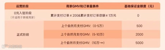 所有类目开放0元试运营,部分商家增设体验保证金,平台垫资商家后缴纳。基础保证金按GMV规模收取,最高不超过5000元!新规下,绝大数商家应缴金额变少,多缴纳部分支持提现。