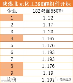 同日,陕西北元化工390.1MW组件集采开标,组件型号为182双面组件,企业报价范围为1.167~1.23元/瓦,均价为1.191元/瓦。
