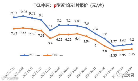 不同尺寸硅片上涨0.2~0.29元/片,涨幅6.3%~7.2%,n型涨幅高于p型,具体如下表所示。