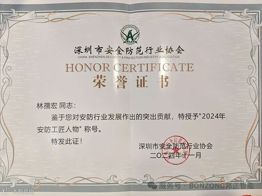 2024年度安防工匠人物、安防新质生产力发展突出贡献奖等荣誉称号。