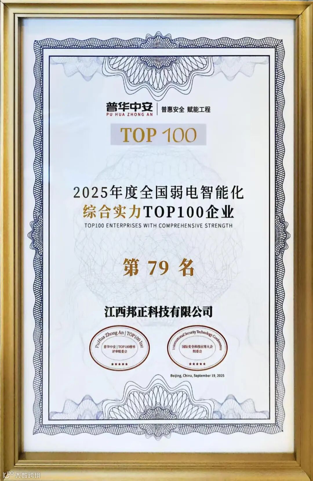 本次江西邦正科技有限公司荣获“2025年度全国弱电智能化综合实力TOP100企业”第79名!