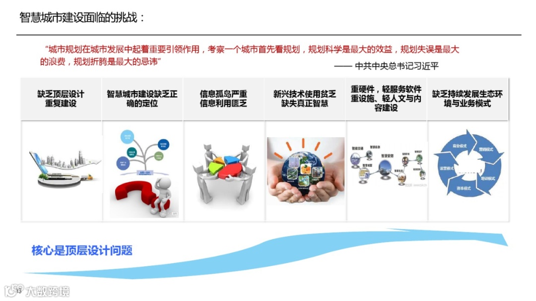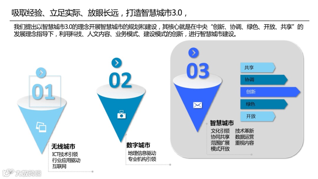 ,解决无纸化办公问题。2012年开始,随着云计算、大数据等新技术的发展,智慧城市的建设进入信息技术驱动的试点探索期,各省市区县纷纷建设云平台、大数据平台,并开始重点项目与应用的数据共享,已初步取得成效。