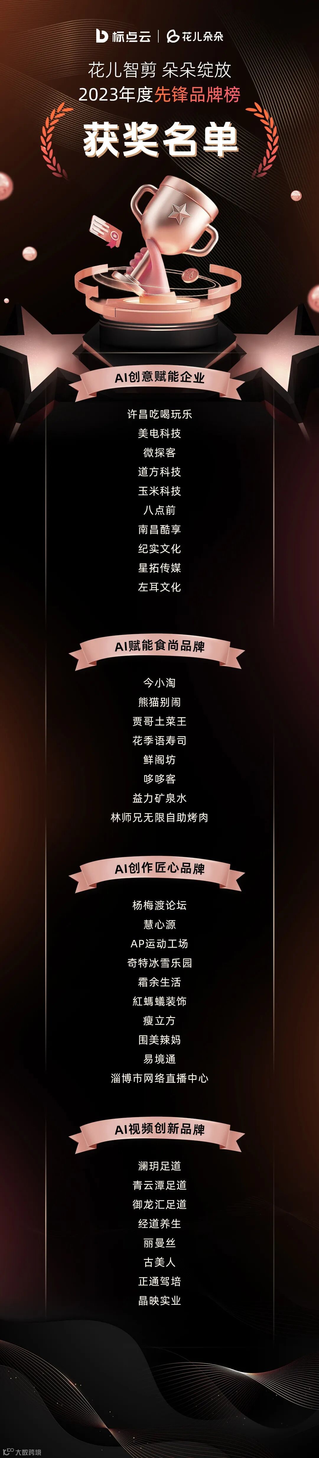 为了盘点2023年度使用花儿朵朵产品的优秀品牌,树立行业先锋典范,让更多品牌或企业得到花儿朵朵产品的赋能,通过AI提升品牌影响力,由标点科技主办,花儿朵朵承办的“花儿智剪,朵朵绽放”2023年度先锋品牌榜应运而生。