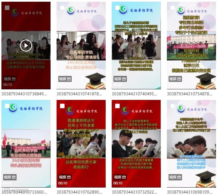 视频时长方面,远拓教育每条视频都把控在10秒以内,保证了视频的完播率。视频文案方面,内容围绕行业相关话题展开,例如单招知识科普、粉丝故事投稿、行业用户痛点等,引发目标受众的共鸣。