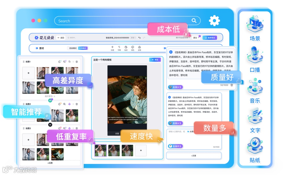 花儿矩阵工具,不仅能矩阵分发视频,还能实现AI批量混剪视频,为矩阵分发做足了内容支撑。而且花儿的剪辑模式可以加封面、加标题、加口播、加贴纸等。每次混剪时只要加上这些关键词句,反复强调视频内容属性,再通过批量化剪辑发布,就能很轻松地被系统打上内容标签了。