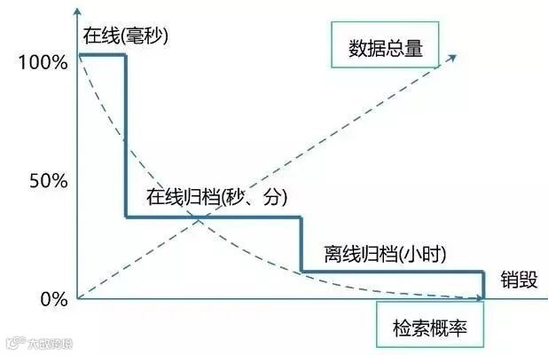 从上图数据生命周期中各参数间的关系中我们可以了解到,数据生命周期管理可以使得高价值数据的查询效率大幅提升,而且高价格的存储介质的采购量也可以减少很多;但是随着数据的使用程度的下降,数据被逐渐归档,查询时间也慢慢的变长;最后随着数据的使用频率和价值基本没有了之后,就可以逐渐销毁了。