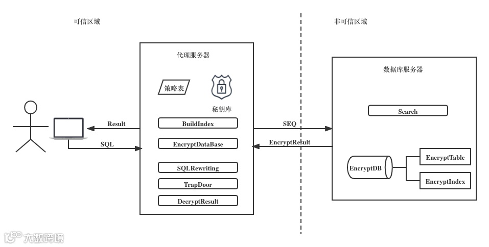EulerDB通过引入代理Proxy(可信区域)进行加解密运算,Proxy部署在客户端。在客户端发起数据库请求时,Proxy先对该SQL命令进行解析和改写,再将指令传输到后台数据库(云数据库或者传统数据库)执行;在远程数据库返回结果时,Proxy先对该结果进行拦截和解密,将解密后的结果展示到客户端。明文和密文的对应关系,加解密的私钥均存储在Proxy端,保证了密文数据和密钥存储位置的隔离,进一步保证数据库的安全。