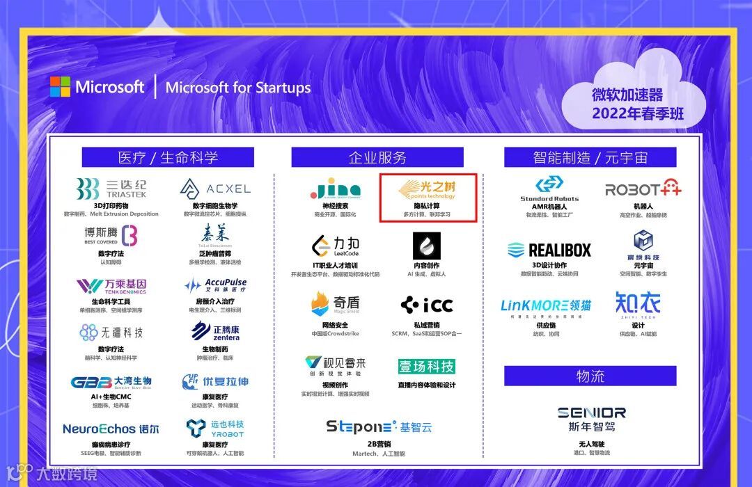 日前,微软加速器公布“微软加速器创业加速计划2022年春季班榜单”。历经2个多月的多轮筛选以及由微软行业专家、VC合作伙伴、外部行业专家组成的评审团严格评选,光之树科技脱颖而出并成为唯一一家入选的隐私计算企业。