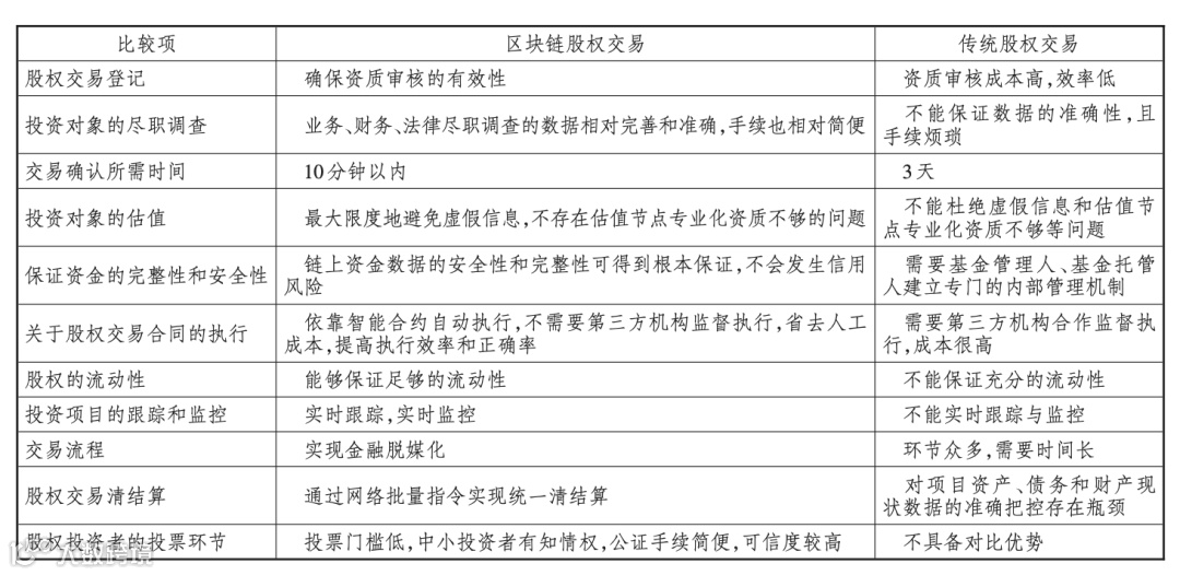 第一阶段是将目前的业务核心数据上链,将纸质的材料电子化,再利用区块链不可篡改的特性,增加数据的置信度。在交易流程、估值、项目的跟踪和监控、清结算的过程中,区块链将体现出了相对于传统技术的优势(见下图)。