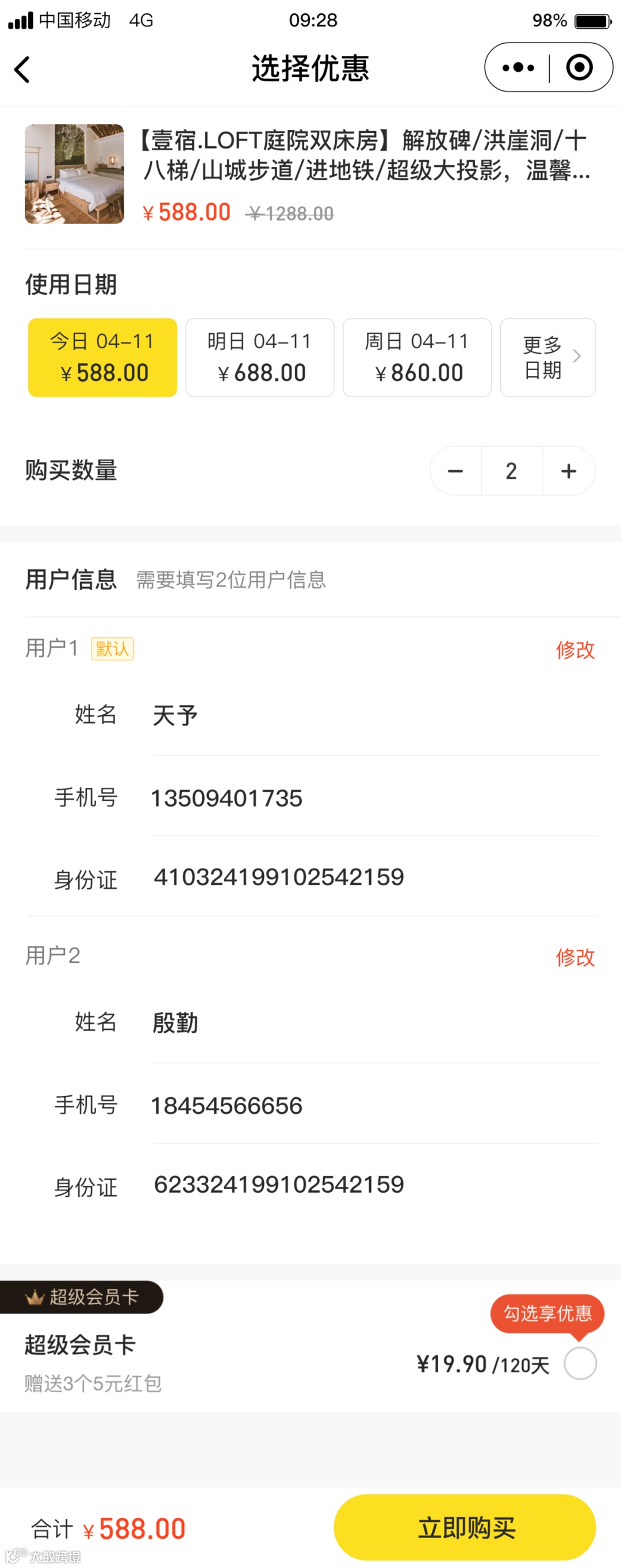实名制:用户下单需根据购买数量填写对应真实用户信息,一组信息包括:姓名+电话+身份证