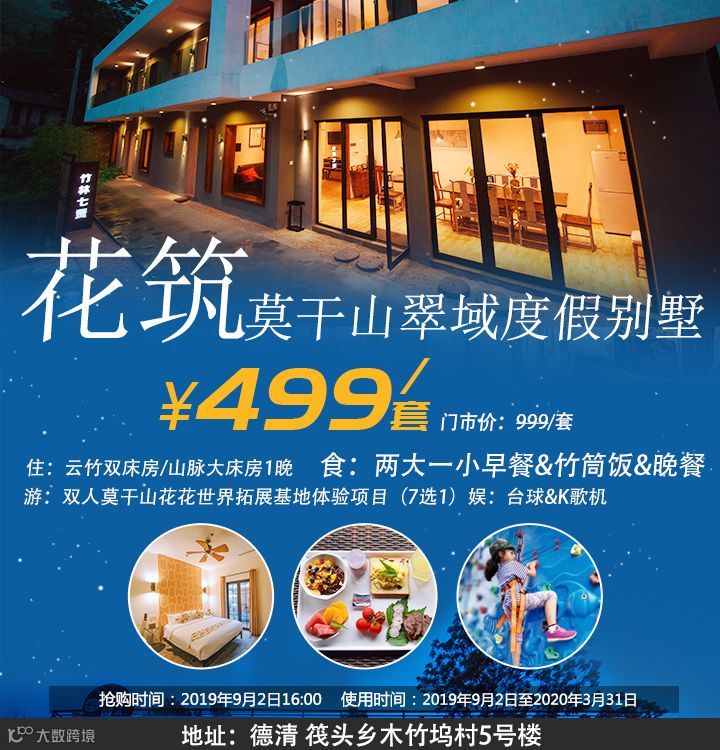 搜索关键词:花筑·莫干山翠域度假别墅!!云竹双床房/山脉大床房1晚+2大1小营养早餐+2大1小亲子晚餐套餐+品尝特色竹筒饭+双人莫干山花花世界拓展基地项目体验(7选1)+免费使用台球桌&K歌机
