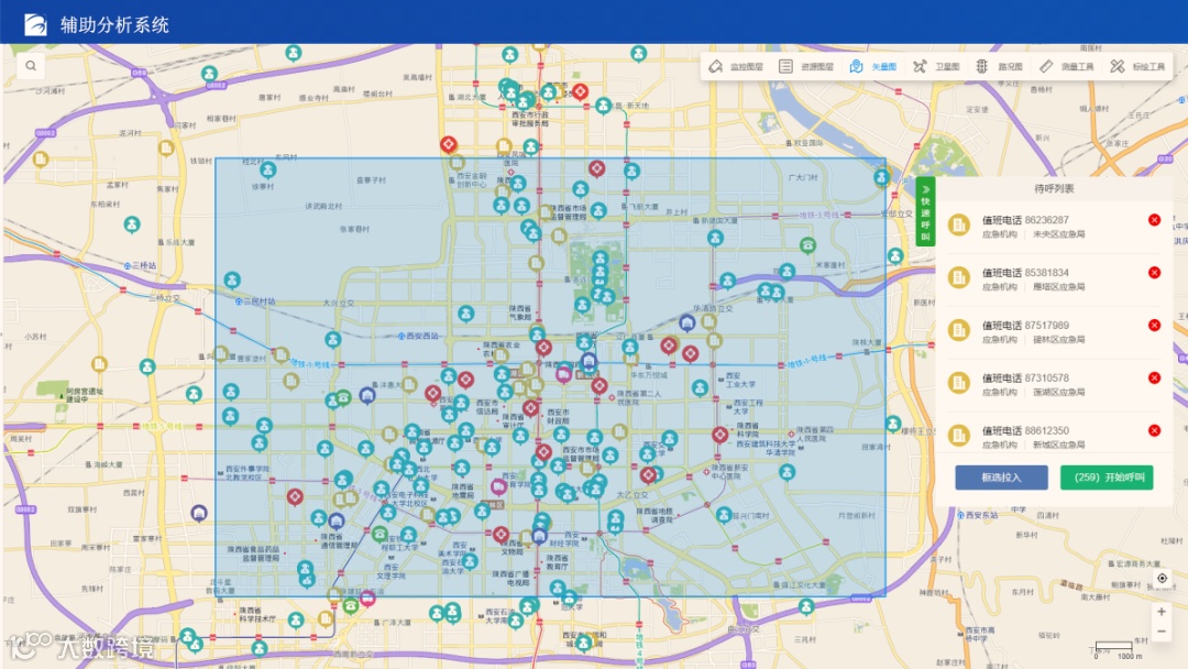 主要是以地图框选的方式查询出应急资源信息并且以列表的方式展示,呼叫按钮可以迅速拨打电话。