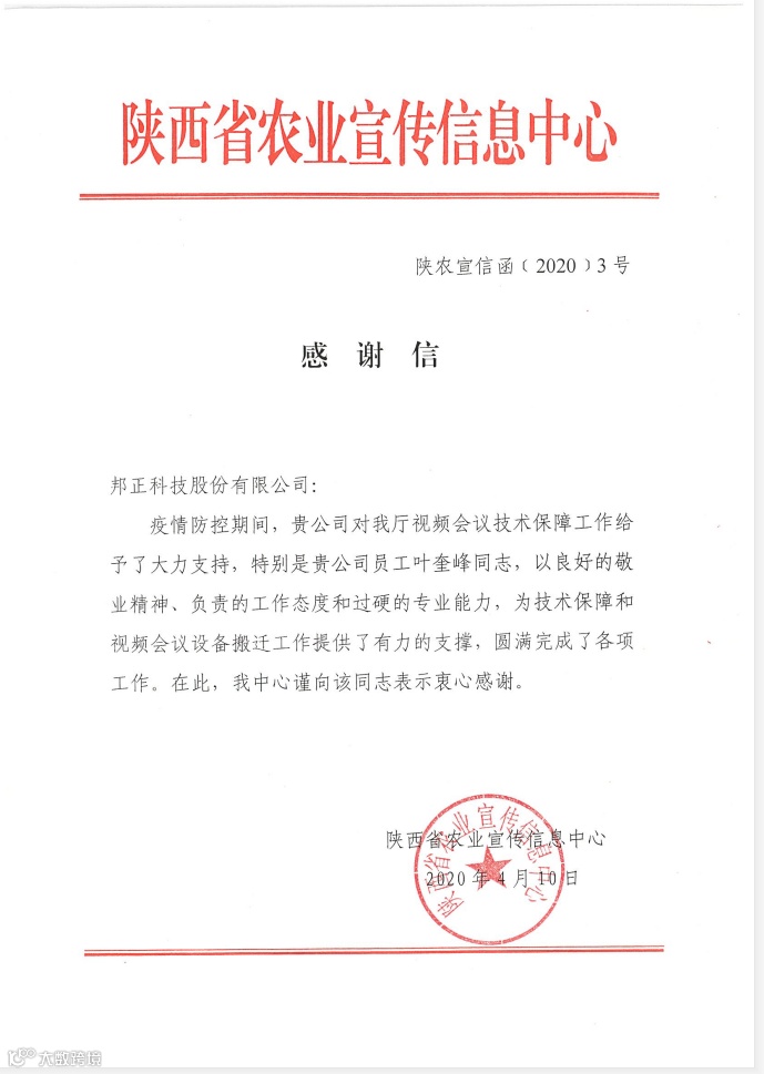 这封感谢信的故事得追溯到2020年春节前,2020年1月15日,邦正科技正式进驻陕西省农业农村厅,对厅视频会议工作进行技术保障和运维服务,保证了省农业农村厅每一次视频会议的顺利进行。