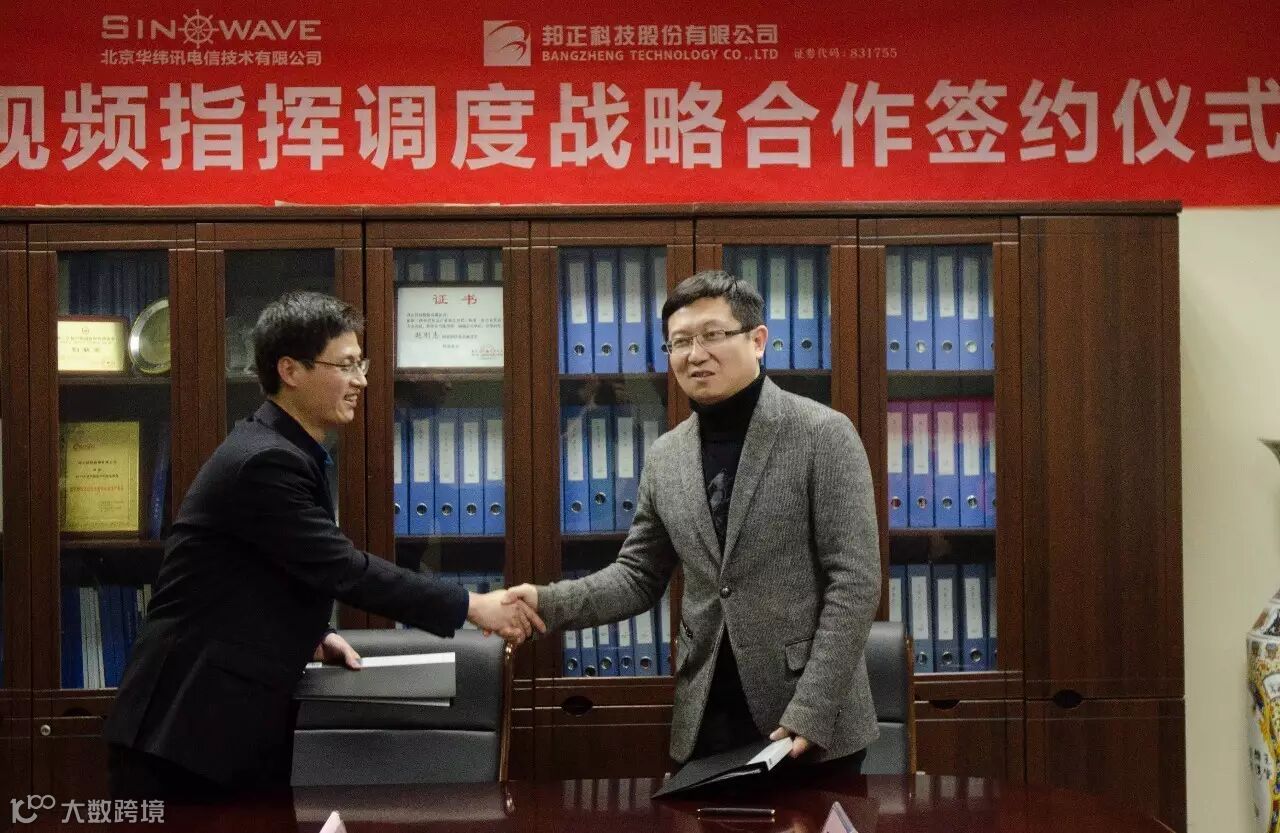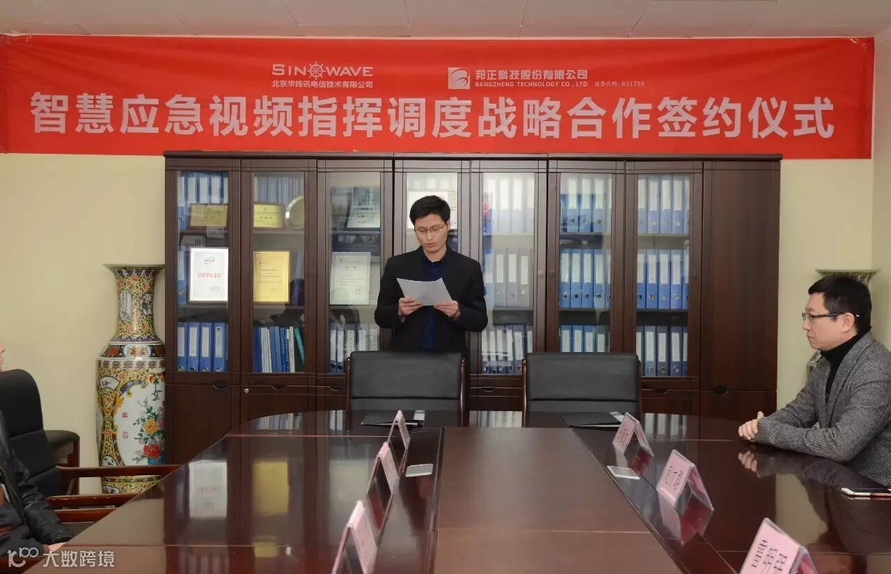 2016年12月30日,2016年的最后一个工作日,邦正科技与北京华纬讯电信技术有限公司(以下简称华纬讯公司)的智慧应急视频指挥调度战略合作签约仪式在邦正科技唐乐阁第一会议室举行。邦正科技副总经理孙晓龙先生等主要领导和华纬讯公司西北大区总经理杨煜成先生等双方领导出席了此次签约仪式。