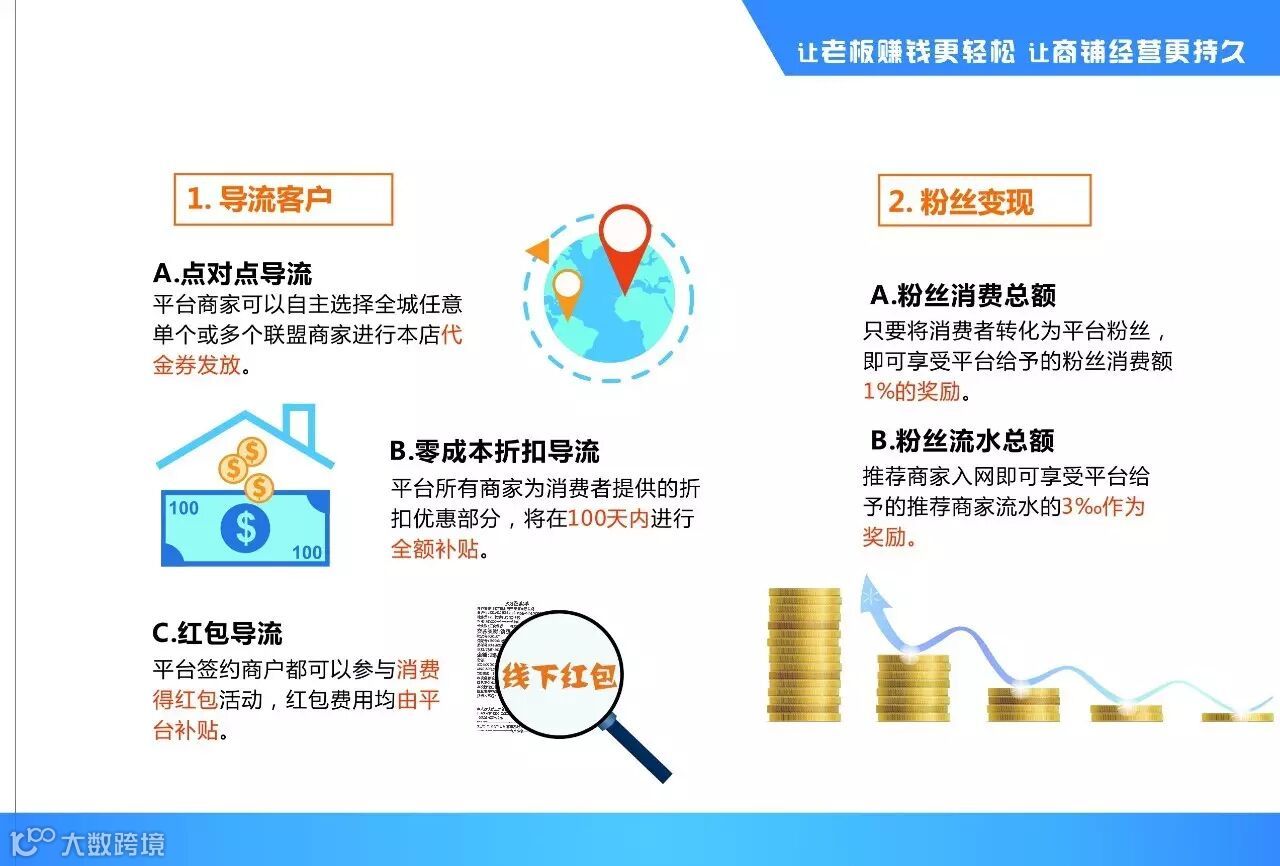 帮助商家嫁接平台,帮助商家开展新型营销,为商户导流线下粉丝,转化粉丝收益,(只要将消费者转化为平台粉丝,即可享受平台给予的粉丝消费额1%的奖励),在商铺经营难题中开展多项补贴政策(平台所有商家为消费者提供的折扣优惠部分,将在100天进行全额补贴,平台签约商户都可以参与消费得红包活动,红包费用均由平台补贴)真是为商户解决营销中的困难,帮助商家互联网的创新改革,并且共享平台资源(平台商家可以自主选择全城任意单个或多个联盟商家进行本店的代金券发放)共享平台粉丝,帮助商家提升10%~300%的营业额。