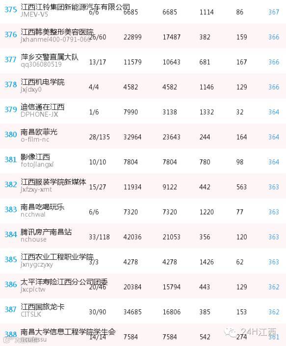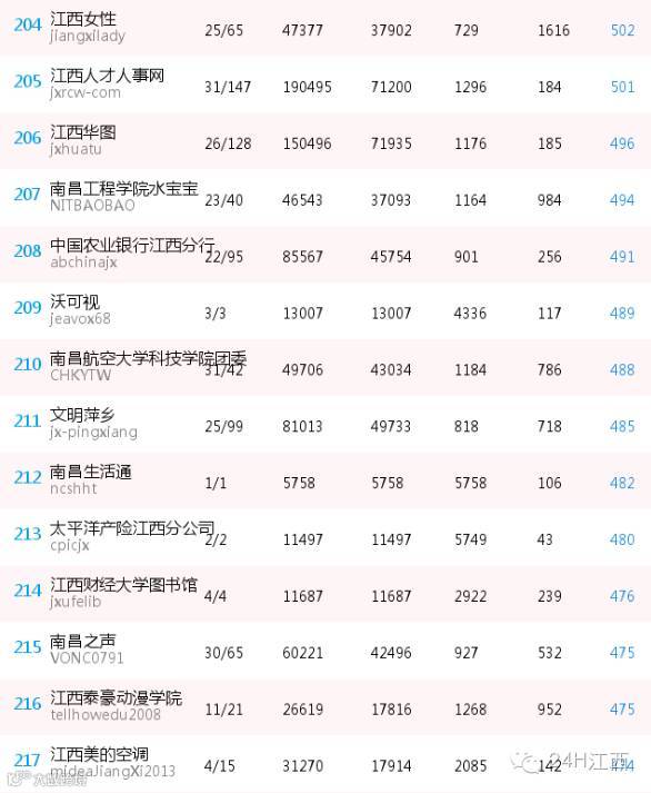 国有企业及工业园区微信公众号的表现乏善可陈,除了江西移动10086与中国石化江西石油分公司进入前20名外,其余进入总榜500强的寥寥可数,这与我省工业与文化强省的战略布局有点“脱节”。