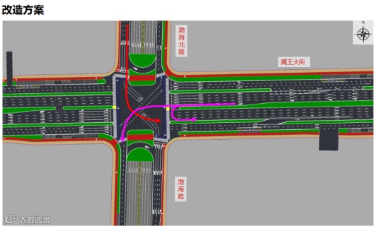 为解决绕行特别是潍坊北站出站绕路问题,实现渤海路与禹王大街交叉口各方向间的交通转换,将对路口进行改造。