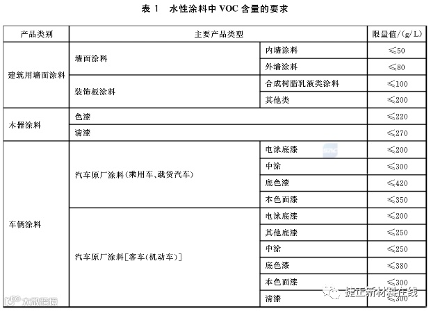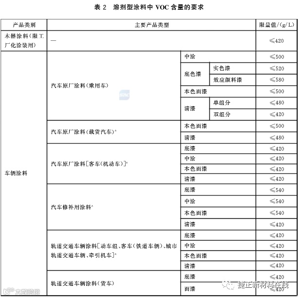水性涂料中VOC含量的限量值应符合表1的要求,,溶剂型涂料中VOC含量的限量值应符合表2的要求,无溶剂涂料中VOC含量的限量值应符合表3的要求,辐射固化涂料中VOC含量的限最值应符合表4的要求。