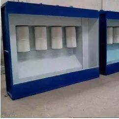 喷粉操作时,未吸附在待涂装工件上的漂浮粉末随室内空气一同被排风机抽吸,流向操作口对面的滤芯,经过滤芯过滤,粉末被截留在室内,而空气则透过滤芯排至室外。这样,当定时用压缩空气反吹滤芯时,滤芯表面的粉末落入室底的集料盒,即可回收再用。连续不断的排风既保持了室内的负压,粉末无法外溢,又保证了室内的粉尘浓度不超过爆炸界线。