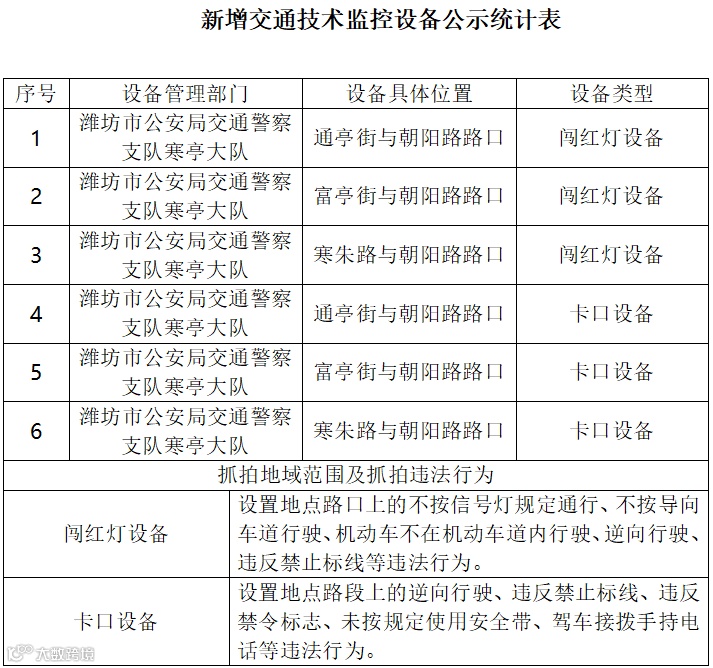 为加强道路交通安全管理,进一步提高交通参与者的安全意识,预防和减少道路交通事故,维护道路交通秩序安全稳定,根据《中华人民共和国道路交通安全法》《中华人民共和国道路交通安全法实施条例》等有关规定,潍坊市公安局交通警察支队寒亭大队决定新增相关电子监控设备开展非现场抓拍交通违法行为。
