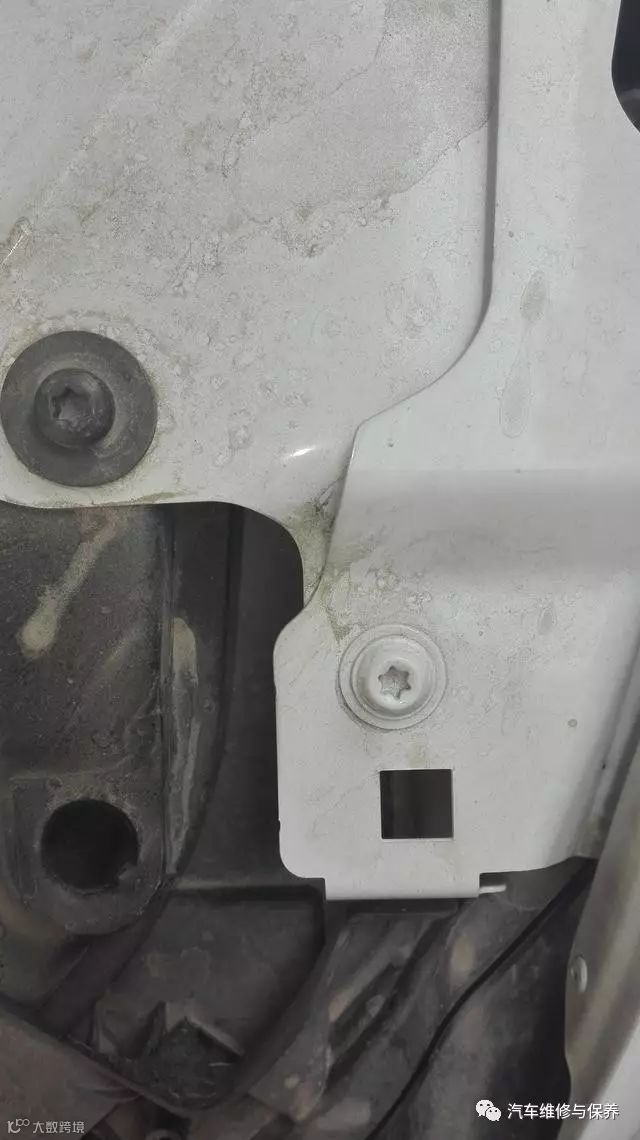 这个就是机盖拆装后留下的痕迹看完图片我给大家讲一下机盖为什么拆装,一般车辆再使用过程中,发生碰撞照成机盖变形,这时必须把机盖拆下来修复,当然小的刮擦不用拆下来直接做漆,明白了吗?机盖拆装证明受力面大必须板金修复或者更换机盖。所以这时候就要注意了!第二个看水箱框架螺丝,这里讲一下水箱框架有的是焊点连接的还有是螺丝连接的,如果是焊点连接的不用管他,那就看水箱框架上的附件螺丝,大灯之类的 如果螺丝都没有动的话就说明前面前面的问题不大!!!事故概率很小了,看下图