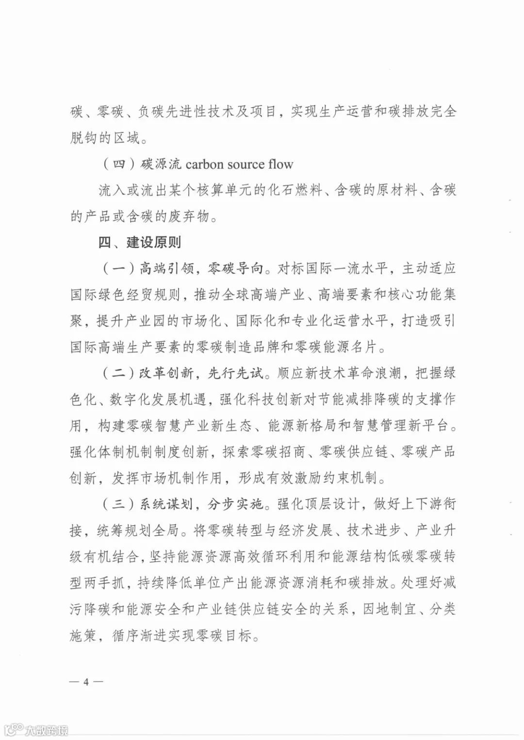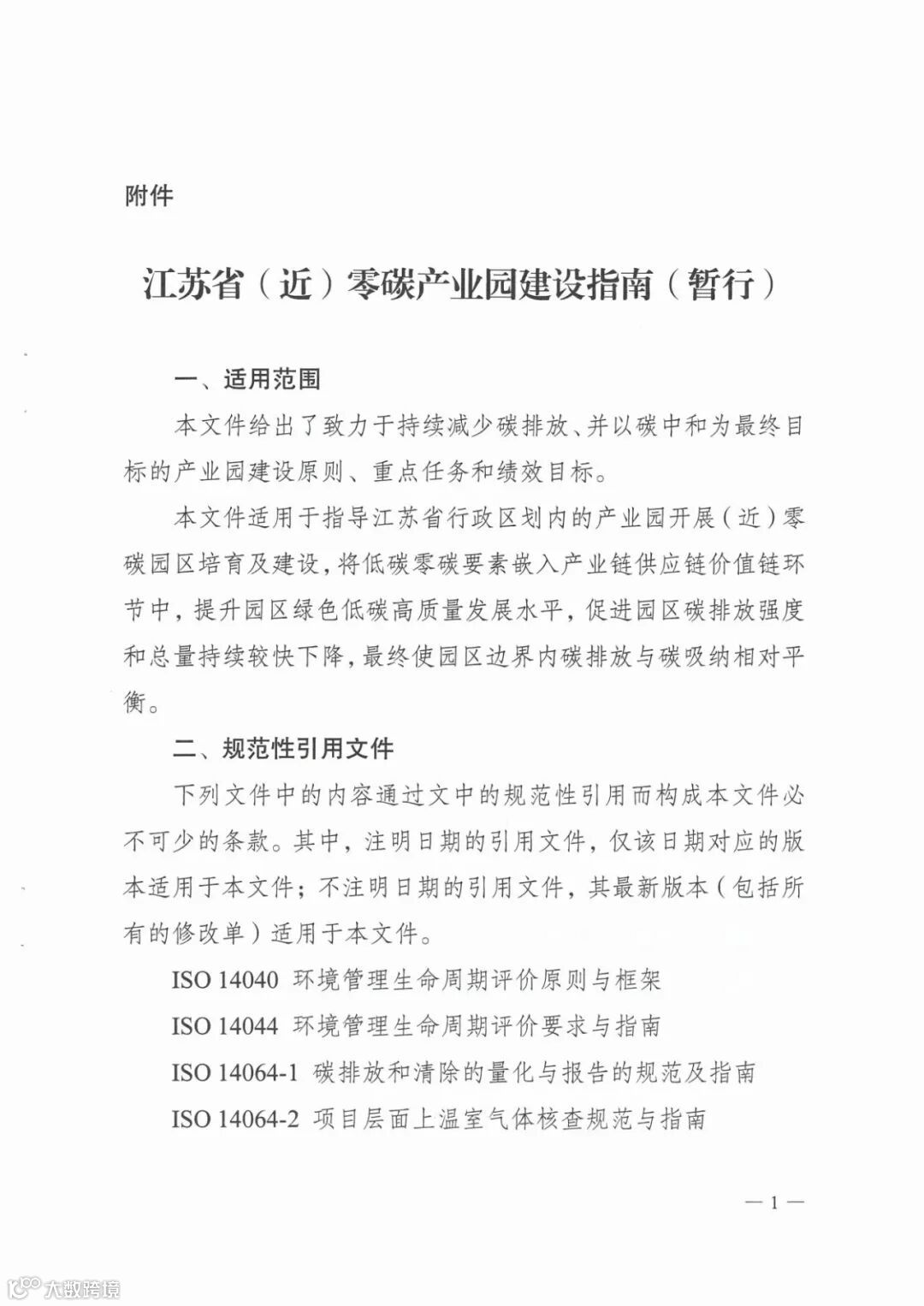 江苏省(近)零碳产业园,要求构建温室气体核算基础能力,并围绕能效水平标杆化、生产过程清洁化、能源供给零碳化、基础设施绿色化、资源利用循环化、运营管理数智化这6个方面开展零碳园区建设。