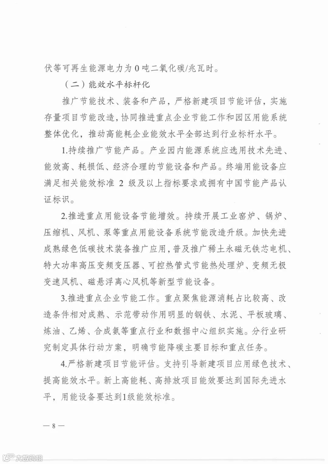 在能效水平标杆化方面,推广节能技术、装备和产品,严格新建项目节能评估,实施存量项目节能改造,协同推进重点企业节能工作和园区用能系统整体优化,推动高能耗企业能效水平全部达到行业标杆水平。