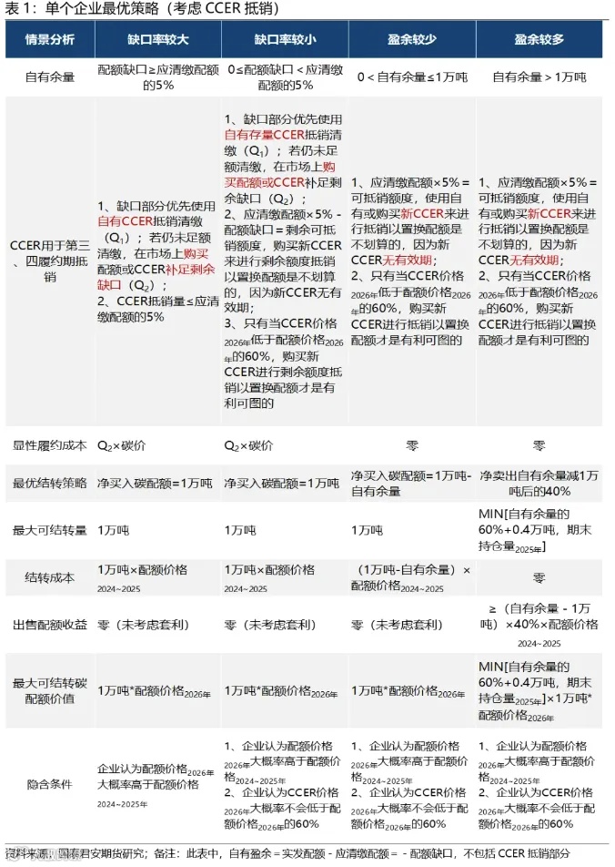 预估企业将使用约500万吨CCER用于发电行业2024年度履约清缴。2024年1月22日全国温室气体自愿减排交易市场启动后登记的CCER(简称“新CCER”)可用于抵销2024年度碳排放配额清缴;参考市场消息,2025年一季度将有超过2000万吨的新CCER获得登记。不过,在配额结转规则下,新CCER大概率只会被用于实际缺口抵销清缴,而使用新CCER置换配额是不划算的,因为新CCER没有有效期。只有当CCER价格2026年低于配额价格2026年的60%,购买新CCER进行抵销以置换配额才是有利可图的(表1)。综上所述,本文猜测约有500万吨新CCER会被用于发电行业2024年度履约清缴。