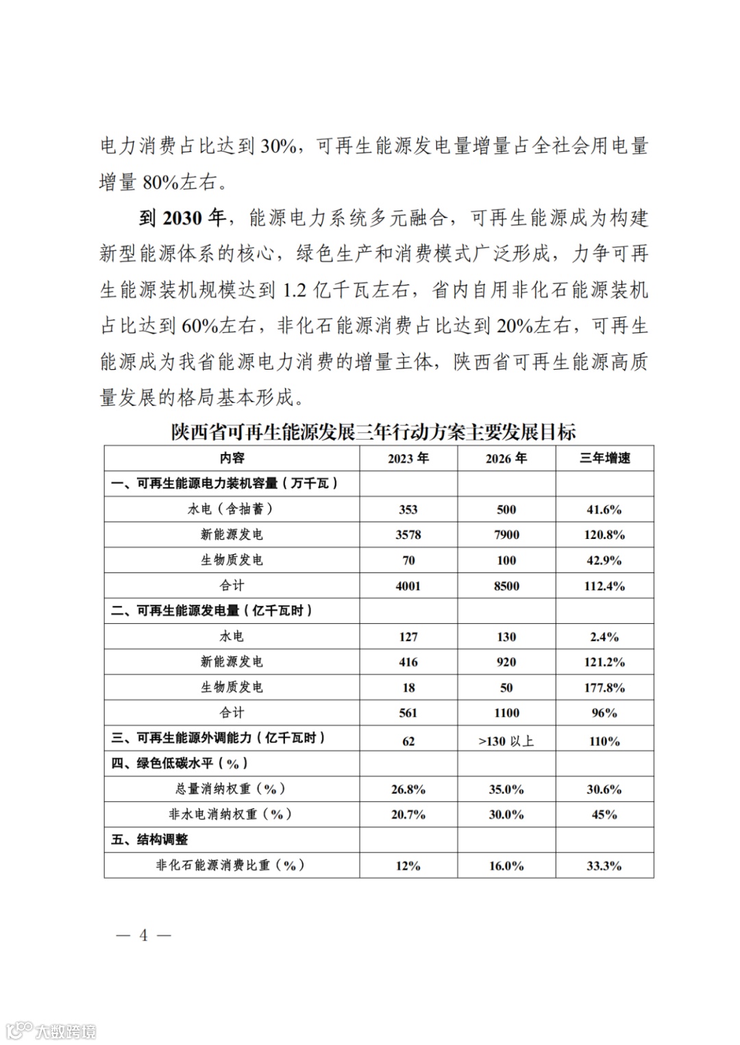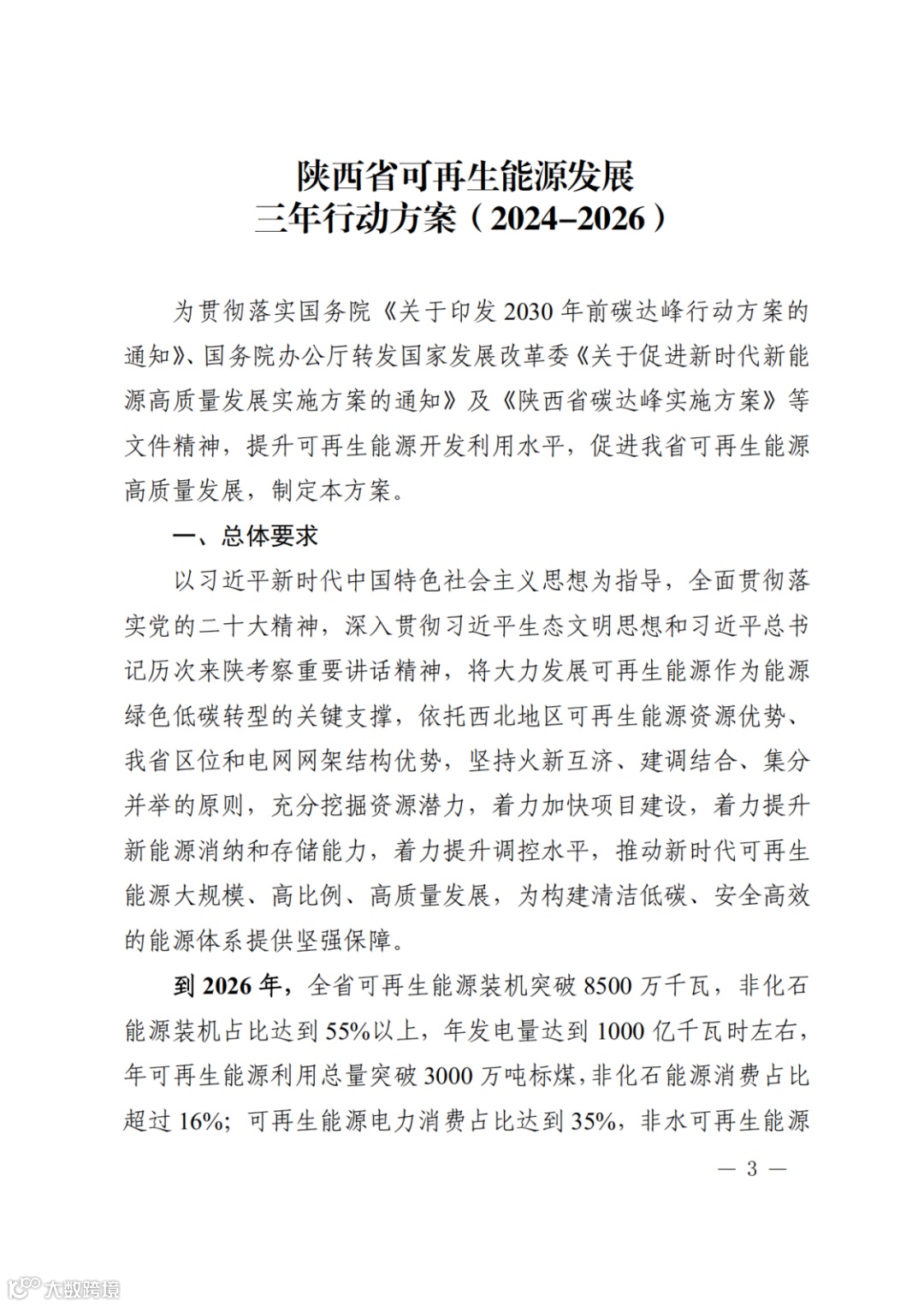 大力推进风电光伏发电规模化发展。结合光伏用地政策,依托毛乌素沙地和陕北黄土高原地形,建设千万千瓦级光伏发电基地。按照国家要求,会同省级林草部门,编制我省光伏治沙实施方案,新增资源量 3000万千瓦以上。推广国家能源关中旱腰带地区农光互补科研成果,建设渭北千万千瓦级农光互补可再生能源基地。以能源绿色发展为底色,在陕南地区因地制宜发展林光互补、茶光互补等“光伏+”模式,打造陕南绿色能源一体化发展先行区。每年竞争配置1000万千瓦可再生能源建设规模,确保项目接替有序。启动市场化项目研究,通过配置一定比例的储能设施,探索可再生能源与储能协调发展新路径。到2026年,建成榆林2000万千瓦级,延安、渭南1000万千瓦级,全省20个100万千瓦级可再生能源发展示范县。