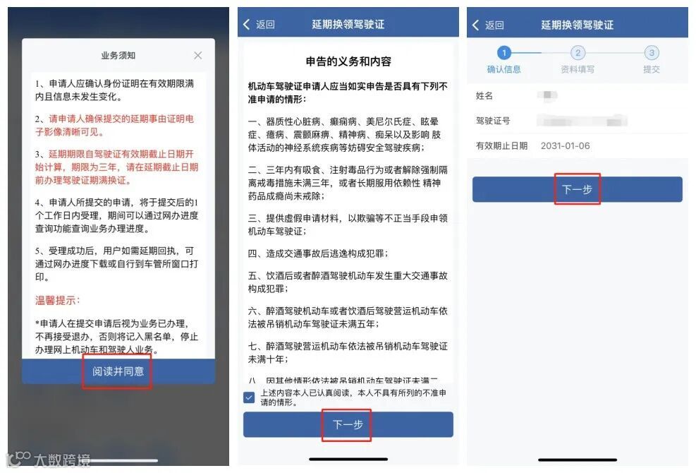 步骤二:认真阅读业务须知后,点击【阅读并同意】,确认用户申告内容,进入驾驶人信息确认页面,确认信息包括姓名、驾驶证号码、有效期止日期,核对无误后点击【下一步】。
