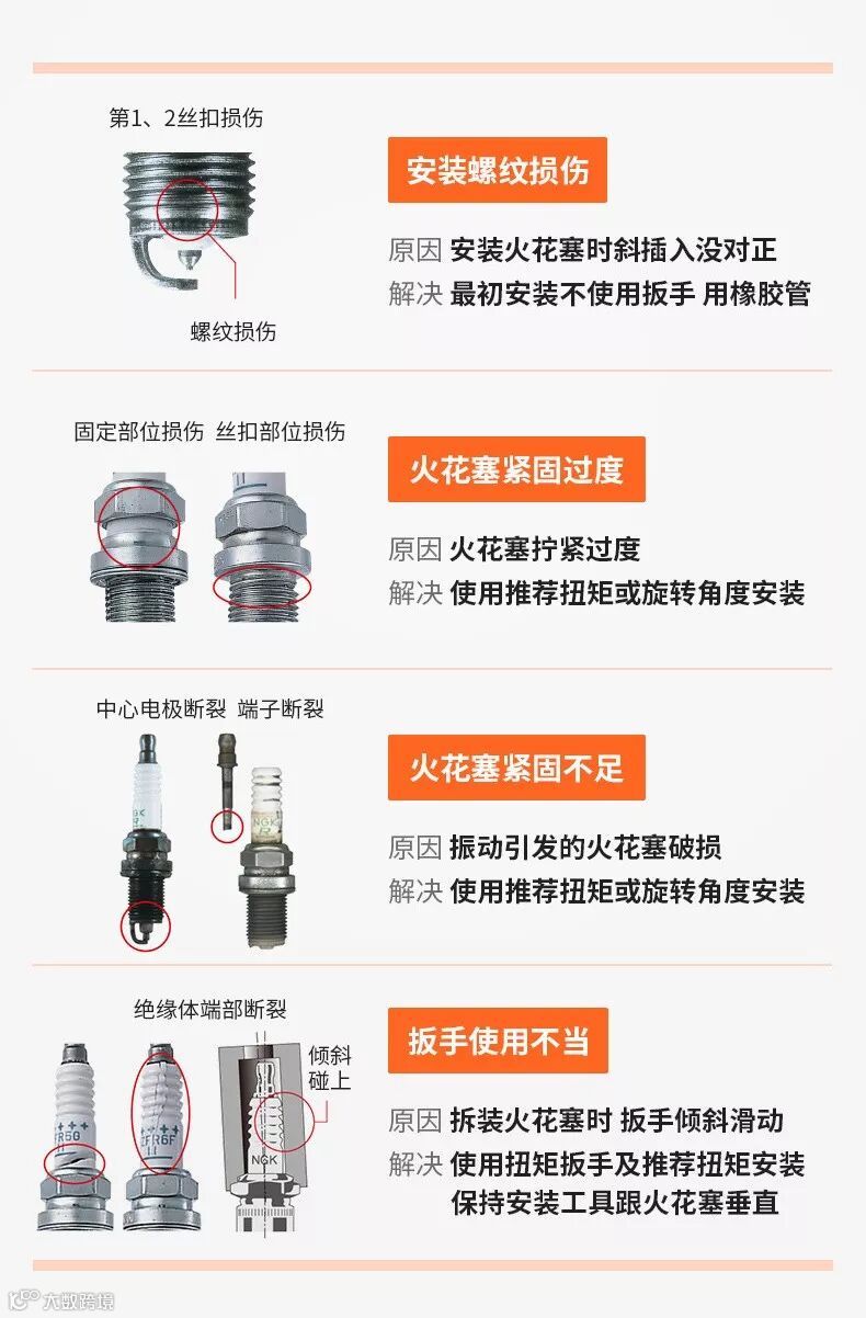 总结:日常用车的过程中要做好火花塞的保养和更换,具体的应该做到“五忌”,即使用火花塞过程中忌冷热不分、忌长期使用、忌长期不清除积炭、忌随意除垢、忌火烧。这样可以延长火花塞寿命,确保发动机经济、安全运转。安装不注意,火花塞会出现以下甚至更多损伤问题: