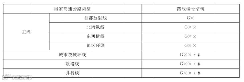 国家高速公路编号首位由一位国道字母标识符“G”表示。其中,首都放射线、北南纵线、东西横线和地区环线等主线编号,由一位国道字母标识符“G”和不超过两位的数字编号“×”或“××”组配表示。