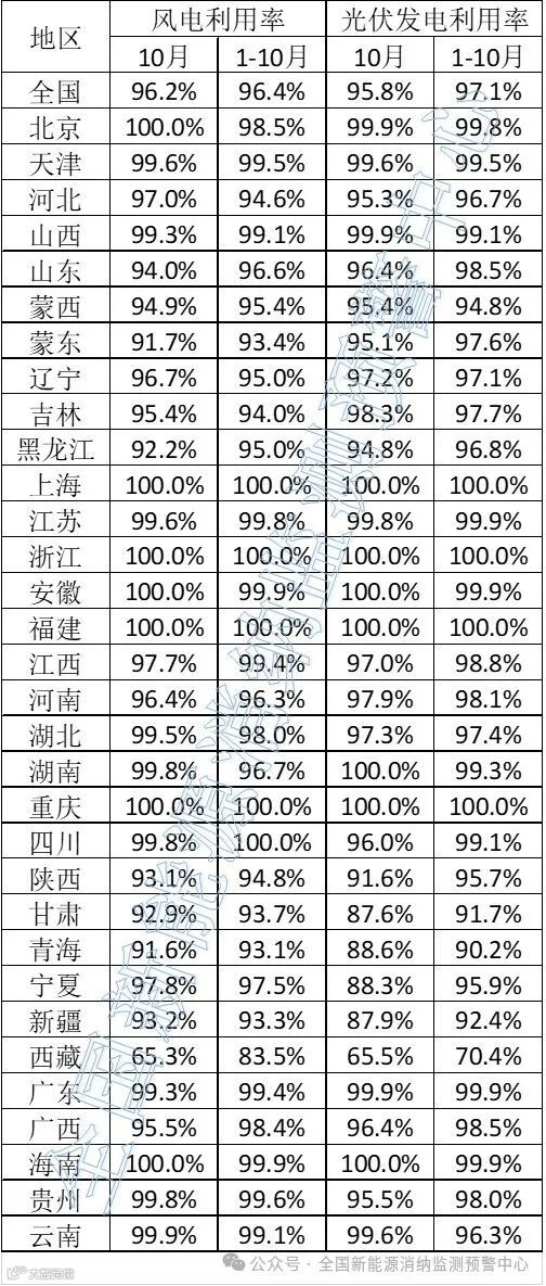 近日,全国新能源消纳监测预警中心也是发布了10月份的风光发电利用率,10月份数据中7个省/市的光伏发电利用率为100%,相比上个月,北京、天津、山西、广东“痛失”当月100%光伏发电利用率。具体原文如下: