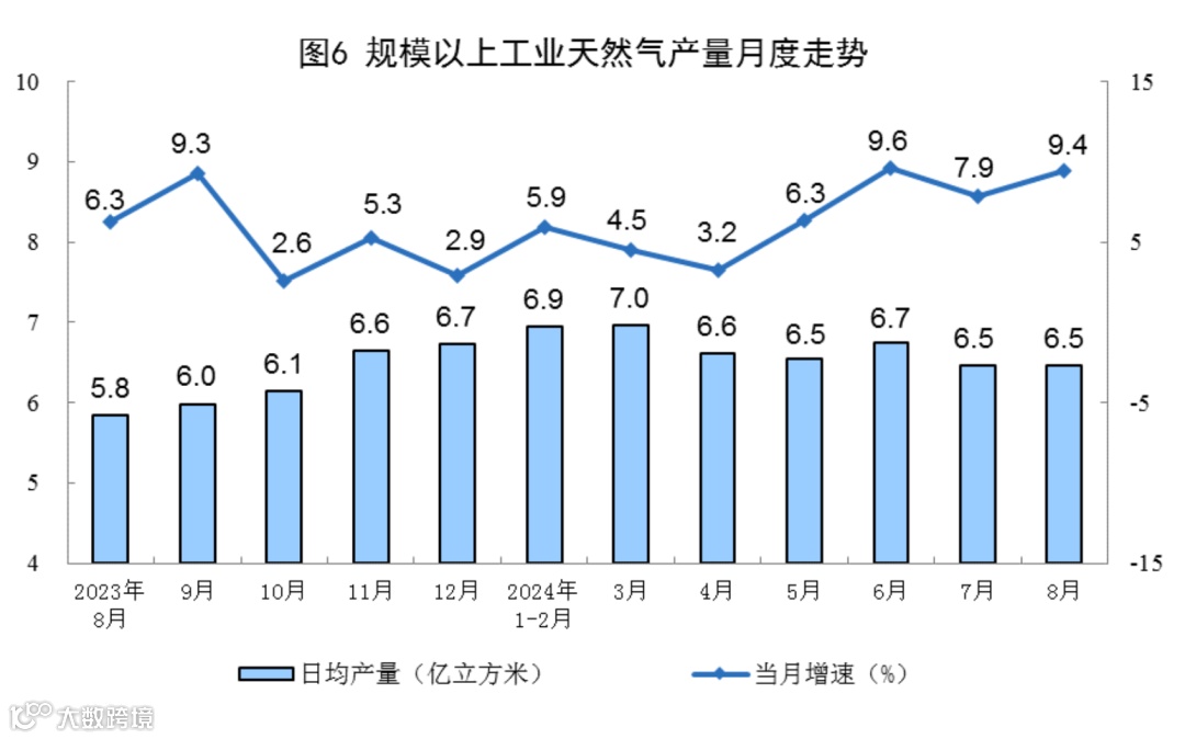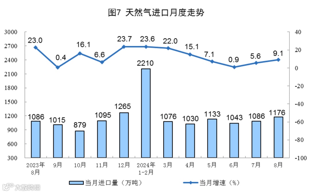 天然气生产加快。8月份,规上工业天然气产量200亿立方米,同比增长9.4%,增速比7月份加快1.5个百分点;日均产量6.5亿立方米。进口天然气1176万吨,同比增长9.1%。