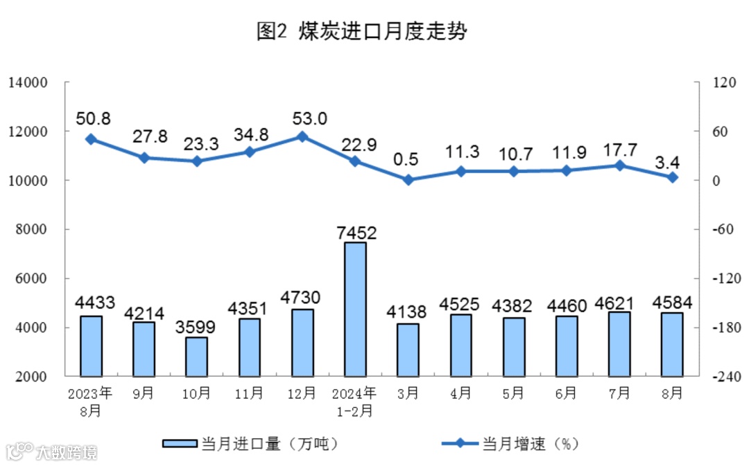 原煤生产平稳增长。8月份,规上工业原煤产量4.0亿吨,同比增长2.8%,增速与7月份持平;日均产量1279.2万吨。进口煤炭4584万吨,同比增长3.4%。