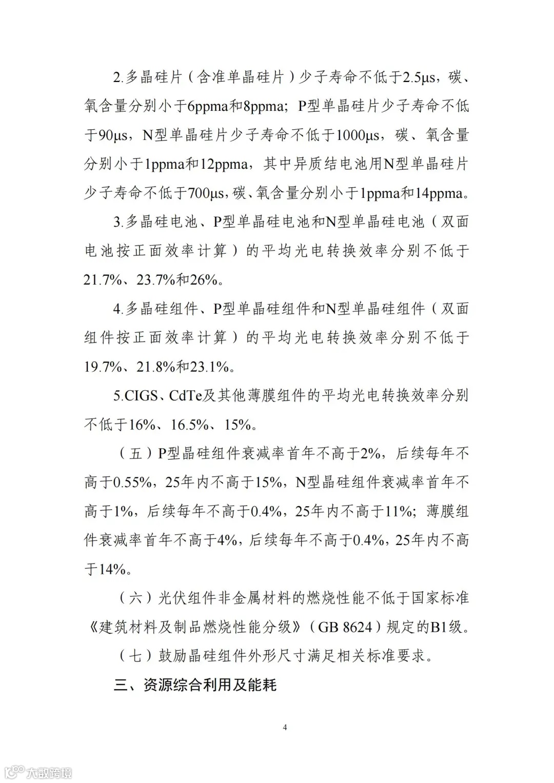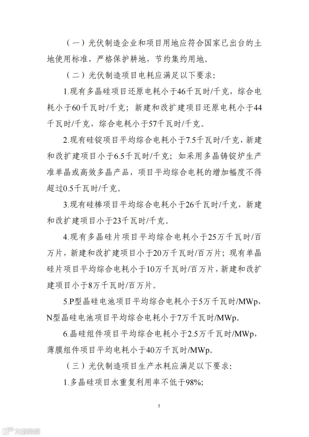 《光伏制造行业规范条件(2024年本)》中提到,光伏制造项目电耗应满足以下要求:现有多晶硅项目还原电耗小于46千瓦时/千克,综合电耗小于60千瓦时/千克;新建和改扩建项目还原电耗小于44千瓦时/千克,综合电耗小于57千瓦时/千克。现有硅锭项目平均综合电耗小于7.5千瓦时/千克,新建和改扩建项目小于6.5千瓦时/千克;如采用多晶铸锭炉生产准单晶或高效多晶产品,项目平均综合电耗的增加幅度不得超过0.5千瓦时/千克。现有硅棒项目平均综合电耗小于26千瓦时/千克,新建和改扩建项目小于23千瓦时/千克。现有多晶硅片项目平均综合电耗小于25万千瓦时/百万片,新建和改扩建项目小于20万千瓦时/百万片;现有单晶硅片项目平均综合电耗小于10万千瓦时/百万片,新建和改扩建项目小于8万千瓦时/百万片。P型晶硅电池项目平均综合电耗小于5万千瓦时/MWp,N型晶硅电池项目平均综合电耗小于7万千瓦时/MWp。晶硅组件项目平均综合电耗小于2.5万千瓦时/MWp,薄膜组件项目平均电耗小于40万千瓦时/MWp。