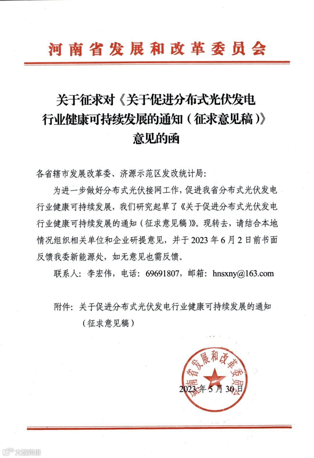近日,河南省发改委下发关于征求对《关于促进分布式光伏发电行业健康可持续发展的通知(征求意见稿)》意见的函。