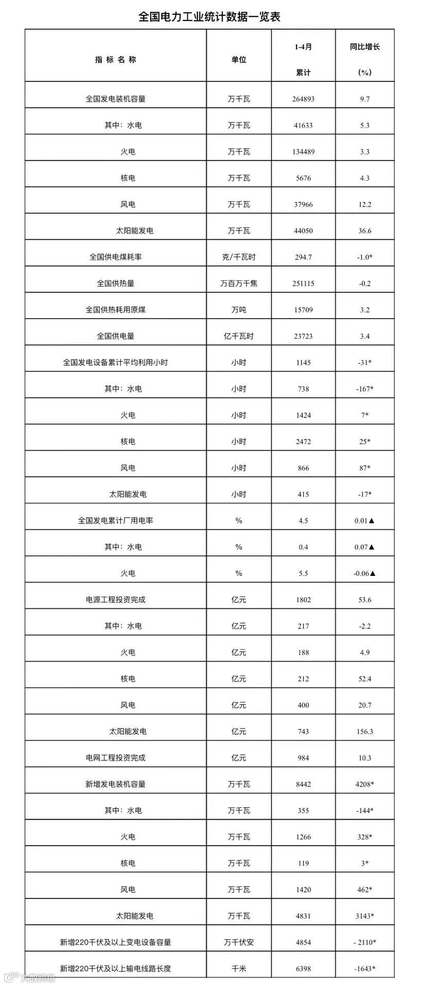 5月19日,国家能源局发布1-4月份全国电力工业统计数据: