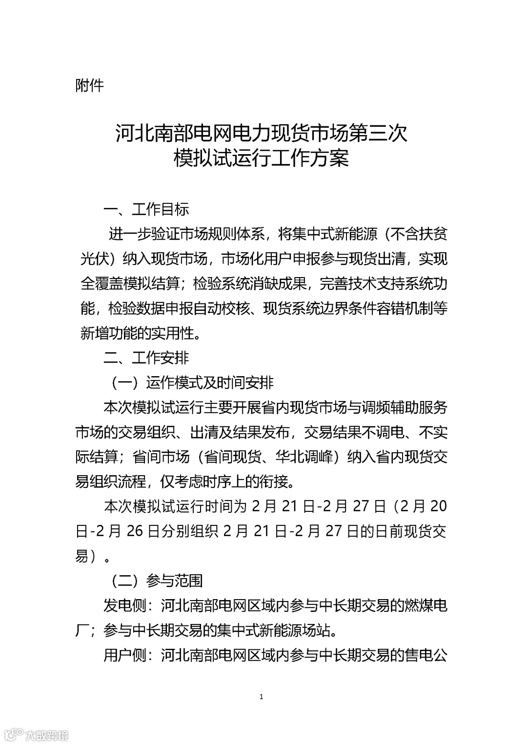 试运行的主要参与对象为河北南部电网区域内参与中长期交易的煤电厂、集中式新能源场站、售电公司及批发用户,代理购电和居民、农业用户仅参与偏差模拟结算。