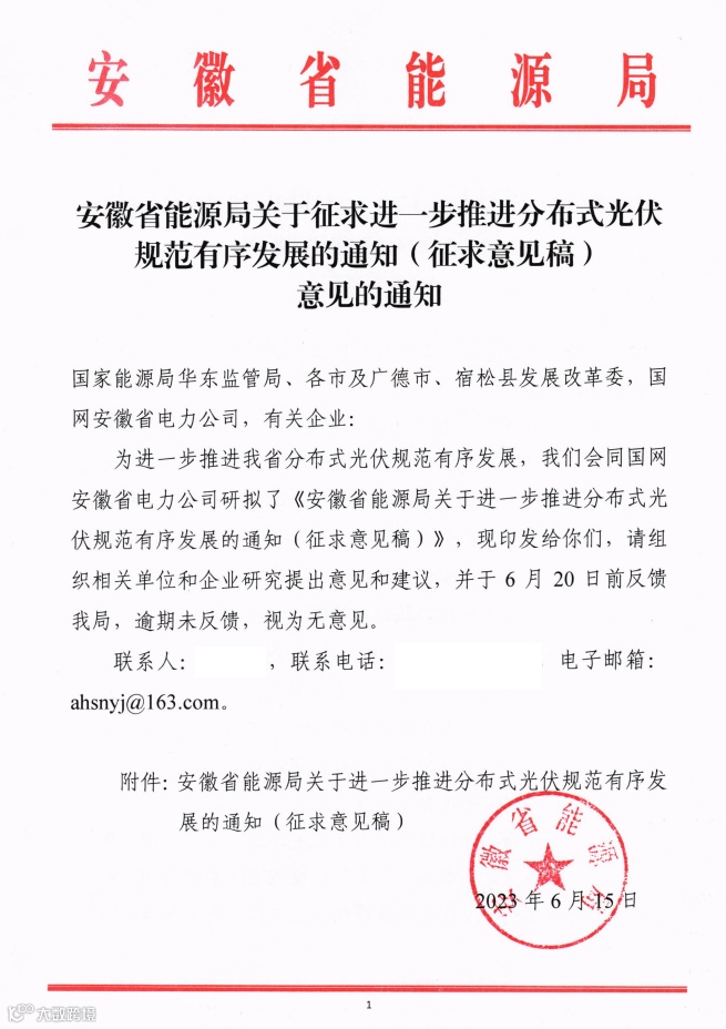 6月15日,安徽省能源局发布《关于进一步推进分布式光伏规范有序发展的通知(征求意见稿)》,从五方面对分布式光伏加强管理,包括:
