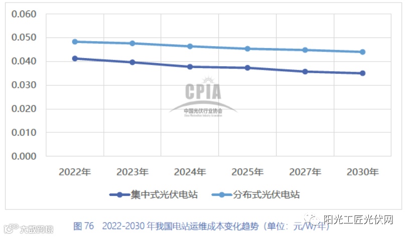 2022 年,分布式光伏系统运维成本为0.048 元/(W·年),集中式地面电站为0.041 元/(W·年),较2021 年小幅下降。预计未来几年地面光伏电站以及分布式系统的运维成本将略有下降。