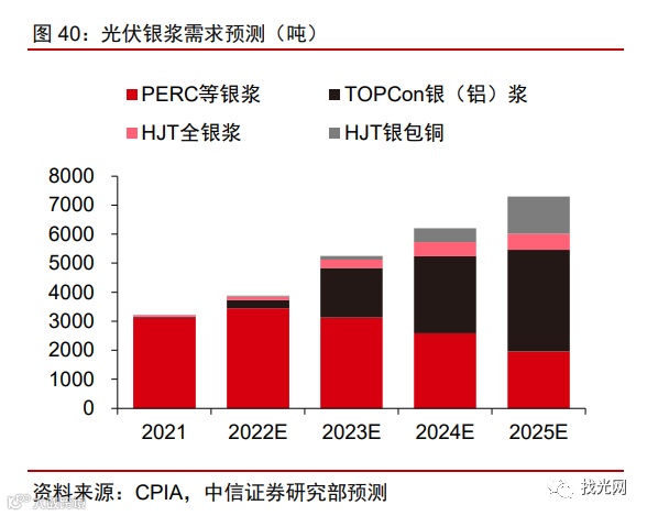 目前主流电池片厂商 PERC 银浆耗量多在 9-12mg/W,而TOPCon 银浆耗量多在 12-16mg/W, HJT 银浆耗量多在 18-23mg/W。