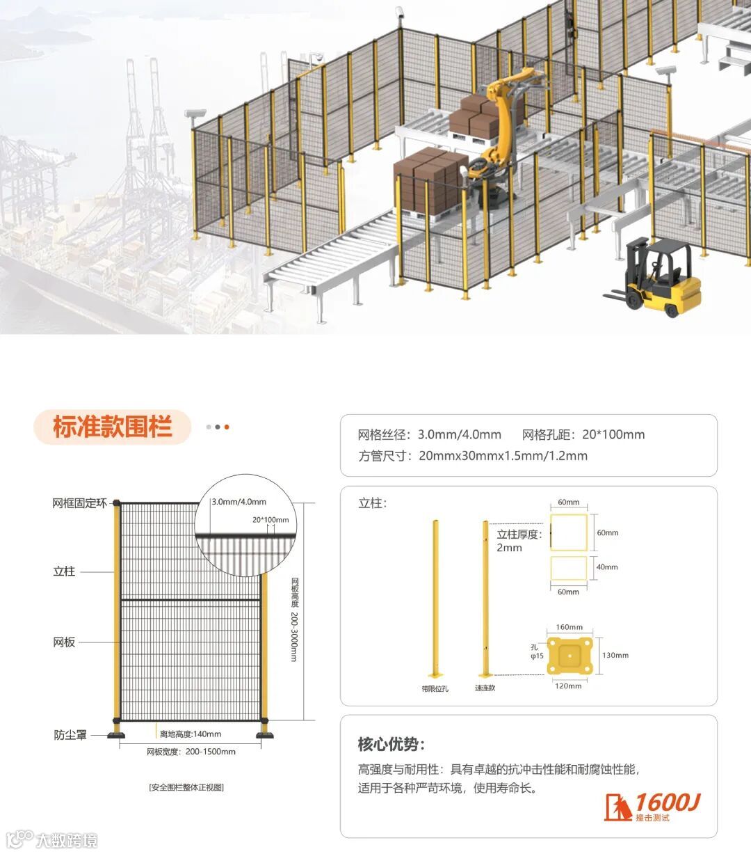 作为基础防护解决方案,标准款围栏采用优质钢材,拥有卓越的结构强度,通过机器人焊接工艺确保焊点均匀牢固;提升整体抗冲击性能。标准款围栏适合对防护等级要求较高的工业场景,如机械加工区、机器人隔离区等,是企业安全防护系统的首选解决方案。