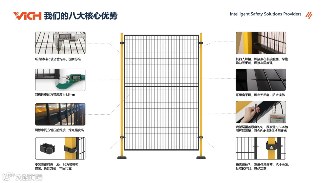 纬诚为企业的不同场景不同需求提供全方位的安全防护解决方案。所有产品系列均采用高于国家标准的材料公差控制;围栏采用机器人焊接焊接牢固度强;采用扁平焊工艺,焊点无毛刺,防止误伤。另外我们还提供不同的防护面板以及各种围栏颜色,支持定制。
