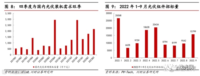 国内方面,受到国内年底并网要求的影响,四季度通常是国内光伏装机旺季,随着硅料新建产能逐步爬产放量,主产业链降价预期增强,预计带动国内大型地面电站装机起量。