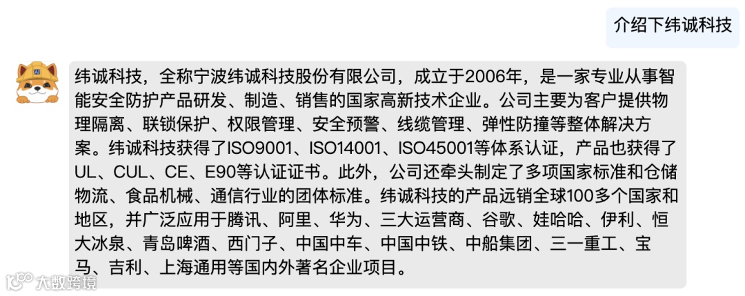 AI智能体以公司吉祥物“安安”为内在“灵魂”,熟悉纬诚科技的公司情况、产品信息,同时对于机械安全的相关国家标准也是非常了解,将成为您身边7×24小时随时随地服务的机械安全专家和解决方案专家。