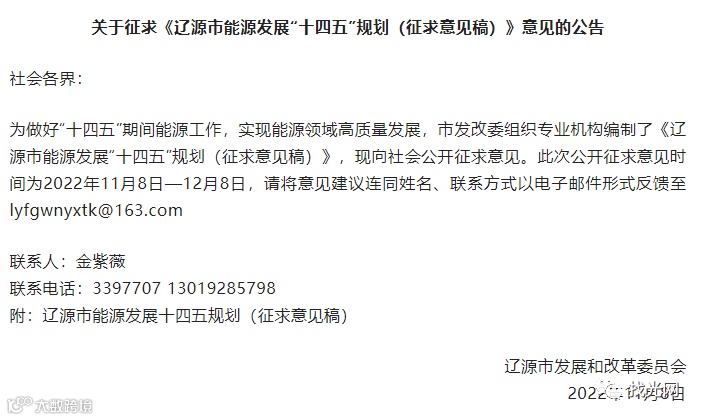 11月8日,吉林省辽源市能源发展“十四五”规划(征求意见稿)发布。