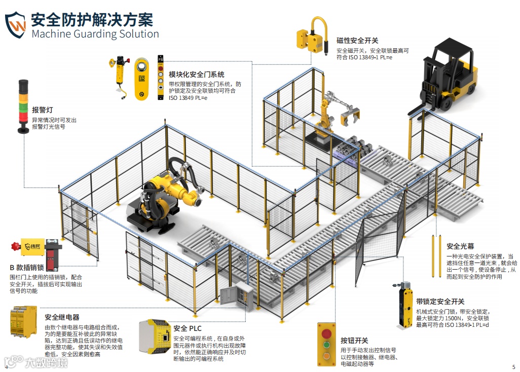 安全防护解决方案在围栏物理隔离的基础上添加了安全锁、警报灯、光栅光幕等,形成智能联动,遇到紧急情况时能做出高效的应急处理。